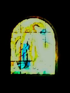 Quickly I came closer to the Being of Light and a few meters from the Manifestation of Light my Vision of the Woman of Light was suddenly replaced by a new vision which was a Miracle Image of a Miracle Icon of the Annunciation. My profound Trance State Ecstasy was now replaced by rationale thinking and with my feet back on the ground I no longer saw a Being of Light nor the Light of the Blessed Virgin, but rather, a human made Icon of Light, that however contained a Miracle Image of an Angel of Light. The Source of Light with beautiful Mystic Colors of the Rainbow of Light suddenly transformed into a man-made glass sculpture with white yellow red pink purple brown green turquoise blue black crystals that depicted the Blessed Virgin with Archangel Gabriel in the Annunciation of the Conception of Jesus.