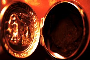 The Gestalt of María is shown highlighted in red color on the red background of the Petal of María. The Image of the Gestalt has similar features as my own statue of Notre Dame de Lourdes, which I had bought in the town of Lourdes before having seen the developed pictures of the Red Rose Petal of María. I did not get on print the Miracle Image of the Yellow Light of María that I had seen right after the Materialization of Red Rose Petal, but the image provides evidence that I could see the Person of Light on the Rose Petal in my Trance Passion State during the celebration of the Passion of the Lord. Once I was back home, I took a few more pictures of my Miracle Relic that shows a Tiny Little Heart within a larger Heart, and within this Tiny Black Heart is Manifest a Light, through Grace of Revelation, for I did not see neither the Light nor the Heart as I took this Miracle Picture of my little Red Rose Petal. Several weeks after the Mystical Experience, when little Red Rose Petal had dried out, I took a couple of pictures of the Rose Petal that I had placed inside a case which I had bought in Lourdes, which had the image of the Blessed Virgin and Saint Bernadette in their classical portrayal of the Apparitions of Lourdes. The Miracle Picture shows the Red Rose Petal inside the case, and on the cover was Manifest the Image of María with Saint Bernadette with the Mystic Light of the Apparition of God. A Face of Light is Manifest on the veil on the back of the head of Saint Bernadette, to establish that Saint Bernadette is the Messenger of God that shows Presence of the Lord.