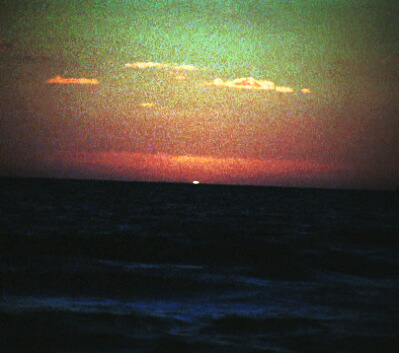 A Green Setting Sun was Manifest during a sunset on the Mediterranean Sea in the Holy Land of Palestina-Israel. During sundown I saw 35 % of the light of the sun Totally Green, but in my 2 pictures I only captured a little of the Green Setting Sun. The Green Setting Sun is shown in 2 Miracle pictures that show Green Light of the Setting Sun; the first picture shows a dot of Green Light and the second Miracle Picture shows 2 symbolic separate images: a Star and the M of Maris (Sea) to form together Stella Maris (Star of the Sea), to remember my Mystic Experience with the Blessed Virgin I had 2 hours earlier in her Monastery of Stella Maris in Mount Carmel, where I had seen the Light of the Holy Spirit during the Night of Pentecost: the Covenant of God with Humankind (Miracles).