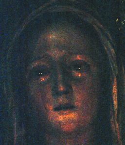 A Black Tear of Sadness that Materialized on the statue of Notre Dame de Banneux changed my life to bring me back into full Awareness of God. A few months later Tears of Light were Manifest in a awesome Miracle Picture on the same statue of Notre Dame de Banneux. The Perfect Sized Tear of Light is flowing down from the rim of the eyelid into the cheek of María; it is Manifest from the Perfect Site of the eyelid of the eye of the statue and it moves down a Perfect Distance on the cheek of María, to end at the Perfect Site of the cheekbone, with the Tear of Light ending as a Perfect Drop of a Water Tear of Light; the statue is weeping a big Tear of Light from the nose and all comes with a Message to humanity as described in detail in my book in about the author section (Book).
