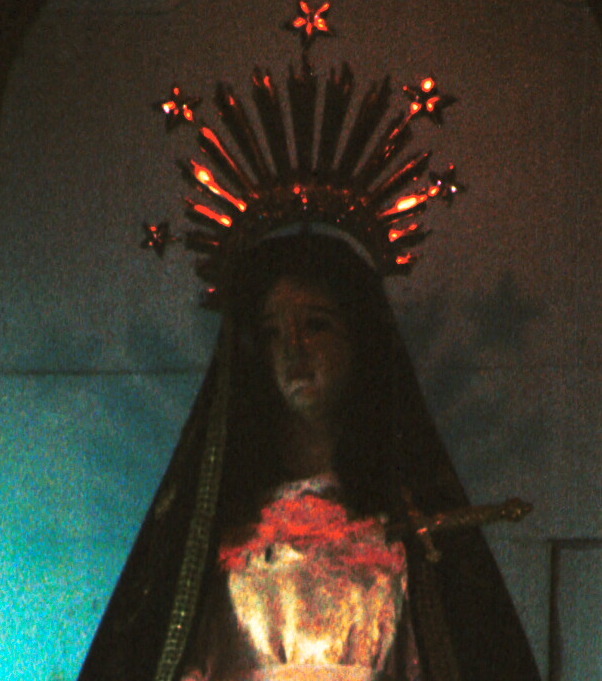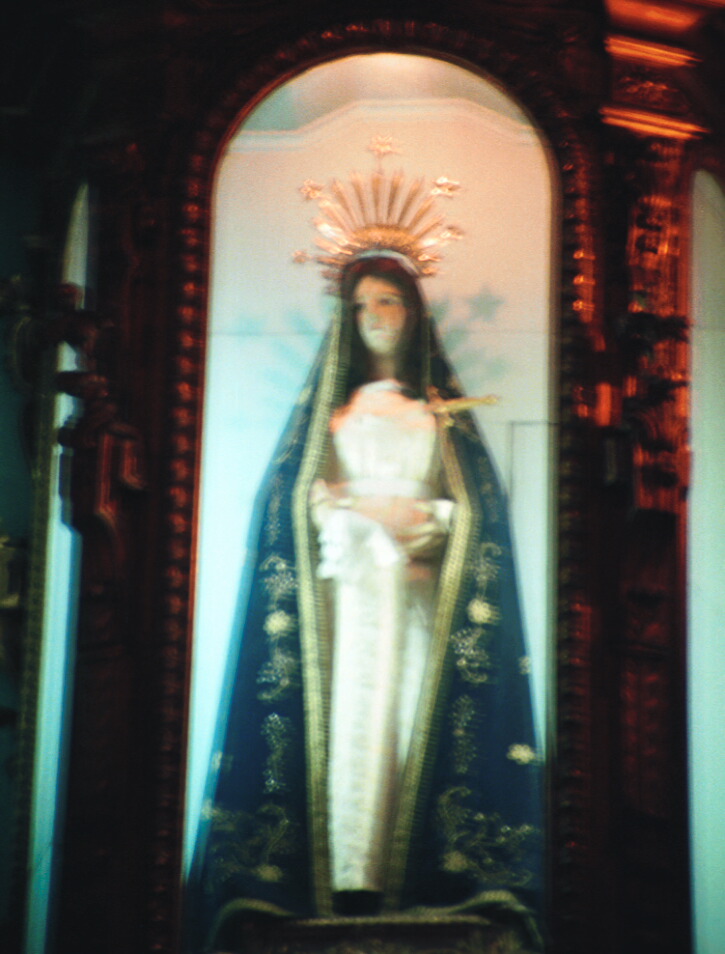 In a Cathedral in Rio de Janeiro two pictures of the same Image of the Martyr María show the Symbolic Message of Pain of a Mater Dolorosa who suffers due to the evils of humanity: a picture shows a Beautiful Impeccable María while the second picture shows a very Sad Distressed María. The Distressed Sad Expression of the statue of María is Manifest in the context of Flames of Fire of suffering pain produced by the Sword of Evil that is stuck in the Heart of the Mater Dolorosa.