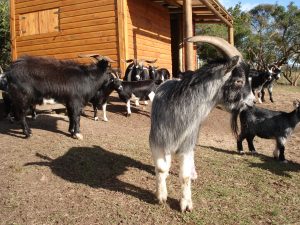 Goats: the goats are totally divine, they do not have problems with diseases; the worse problem they encounter are the dogs of the criminal neighbors or the criminal hunters that kill anything that has 2 legs: like the local ostrich called ñandu, or 4 legs: like my goats. The experience with goats can be difficult because they can be very destructive with trees: they can eat the bark of certain trees and kill them and they rub their horns against the trees. The only way to protect the trees from goats is with a small fence of wire that surrounds the tree, so the goat cannot eat their leaves and eat the bark of the trunk of the tree. Without this wire fence one cannot have goats in a park with trees because in due time they will destroy almost all of the trees; thus, one can choose having goats without trees, or trees with no goats; I decided to have both with the protection of the trees that are eaten by the goats. In addition, the goats are very useful cleaning unwanted bushes that grow as plagues, because the goats eat these plants that horses and cows do not eat and thus you have a biological control of the plagues in the farm. I demonstrate with the sanctuary that one can have many animals of many species (cows, horses, goats, sheep and llamas) circulating free in the park, with ornamental trees and even fruit trees, if you protect the trees with individual fences so the animals will not eat the leaves and mess with the branches of the trees during the growth of the small trees. I show that one can have goats in a park and thus these magnificent animals can be saved from a possible scenario of extermination because the only humans who have goats are the producers of goat milk, because other farmers cannot control the goats in their farms.